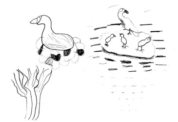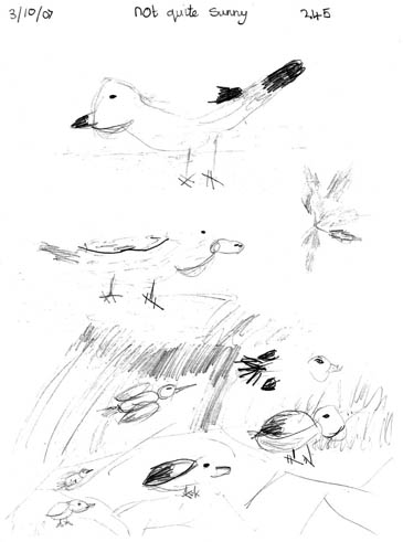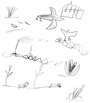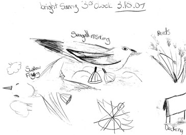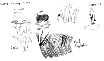 We went to the observation shelter and after learning how to sketch using binoculars, tried it for ourselves. We saw cormorants on the stony islands, a diving grebe and lots of reeds! The idea was to practise being an Artist working in the field, looking into the distance and bringing it close enough to sketch, using the binoculars.